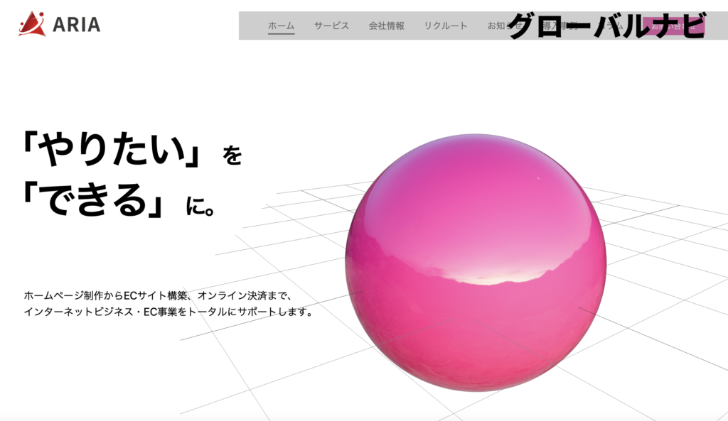 グローバルナビ(グローバルナビゲーション)とは、ホームページ上部に並んでいるメニューの名称です。