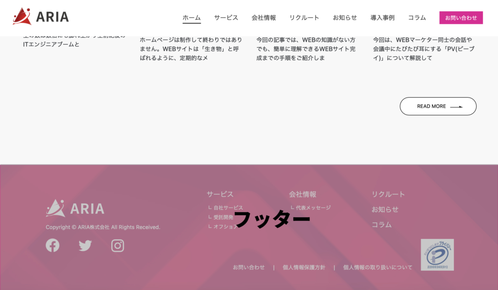 メインコンテンツの補助的な役割があり「企業情報の紹介」「著作権情報の表示」を記載するケースが多いです。